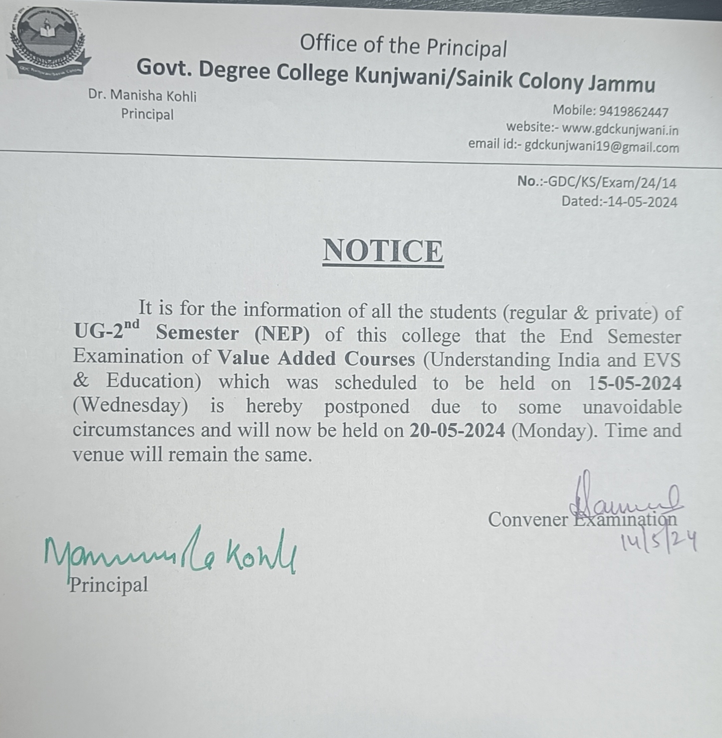 End semester Examination of Understanding India and EVS & Education (VAC) scheduled on 15-05-2024 is postponed and will be held on 20-05-2024