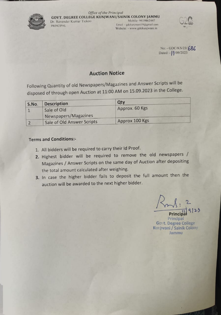 Open Auction Notice of Old Newspaper/Magazines & Answer Scripts on 15-09-2023.
