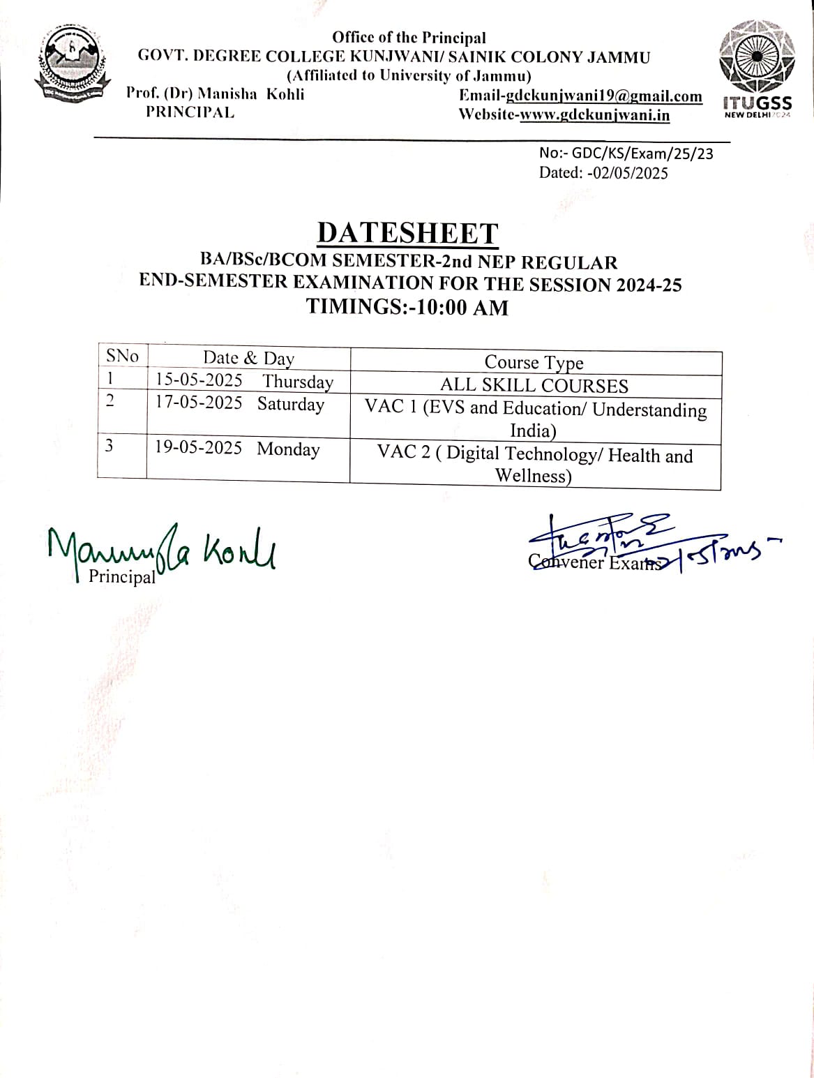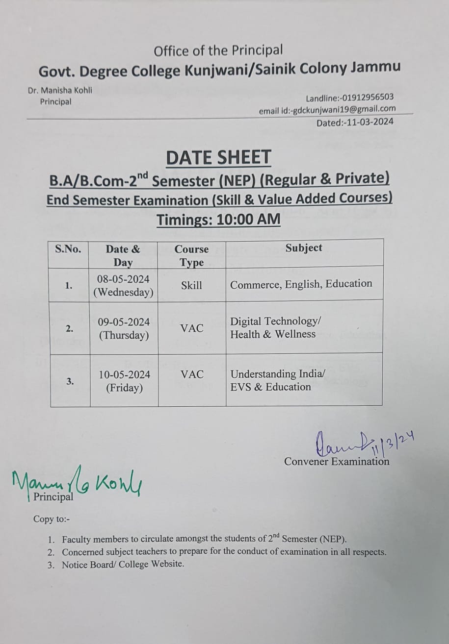 Date sheet BA/BCom 2nd Semester(NEP) (Regular & Private) End Semester Examination (Skill & Value Added Course