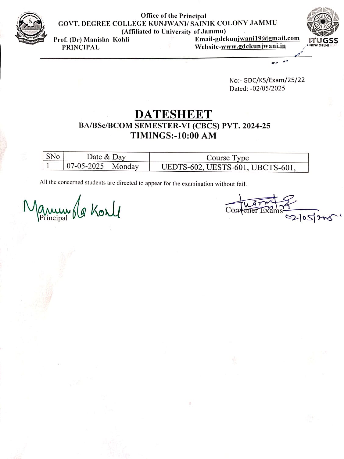 Students who have applied for admission to sem-I (FYUGP) 2023-24 through Jk Samartth portal and have freezed thier seats are advised to report to this college from july 19 to 22, 2023 for varification of documemts and selection of other subjects viz., minor, MD etc.betwwn 10 am to 2pm along with all documents as the list attached herewith