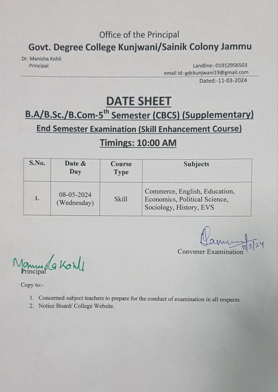 Date Sheet BA/BSc/BCom 5th Semester (CBCS) (Supplementary)End Semester Examination (Skill Enhanncement Course)